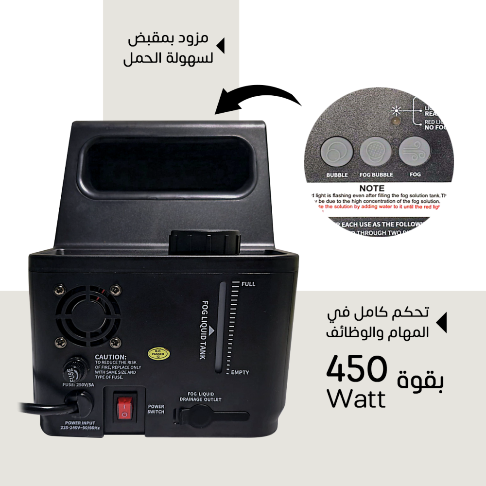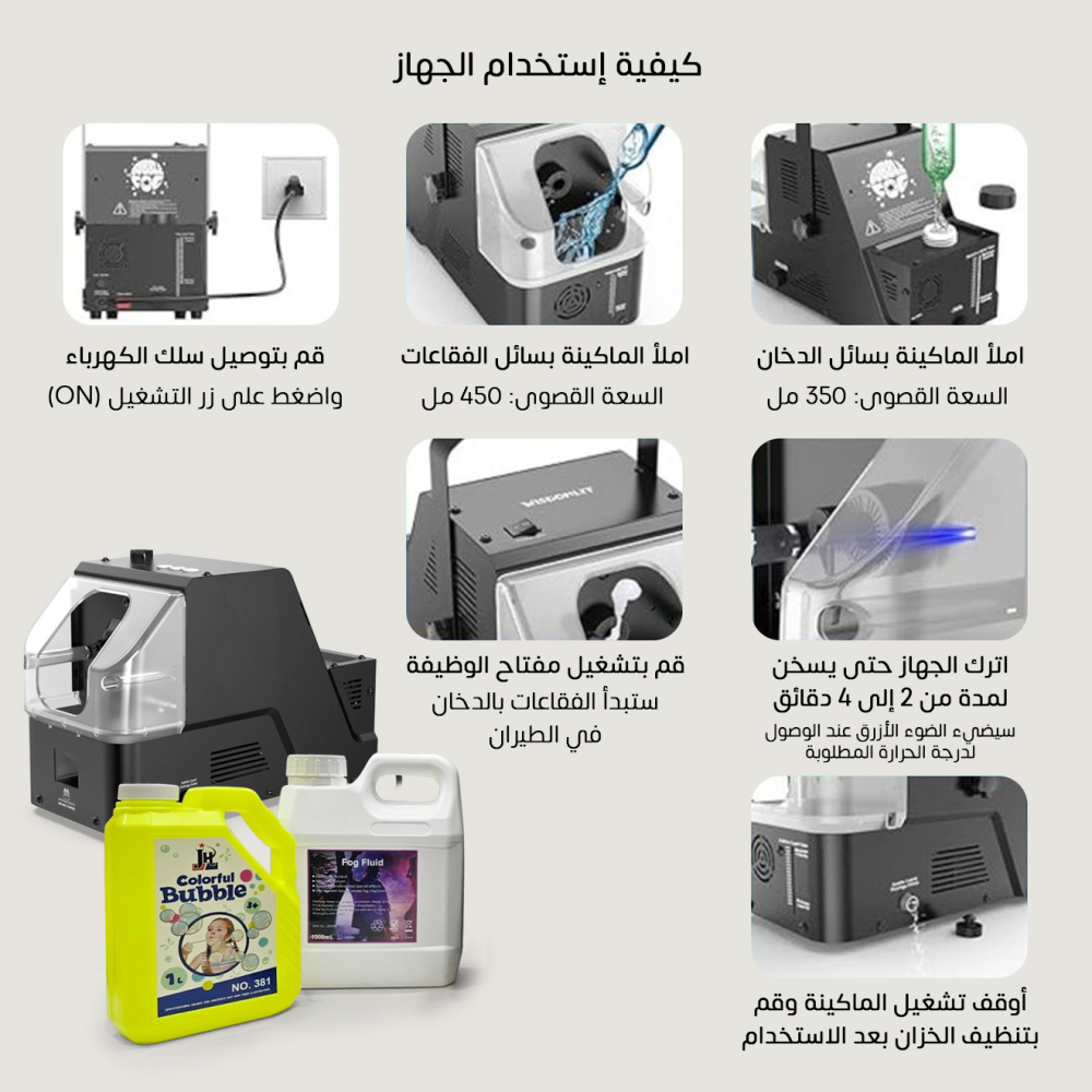 كل ما عليك هو ملء الخزانات بسائل الفقاعات وسائل الضباب، وتشغيل الجهاز بضغطة زر واحدة… استعد للسحر!